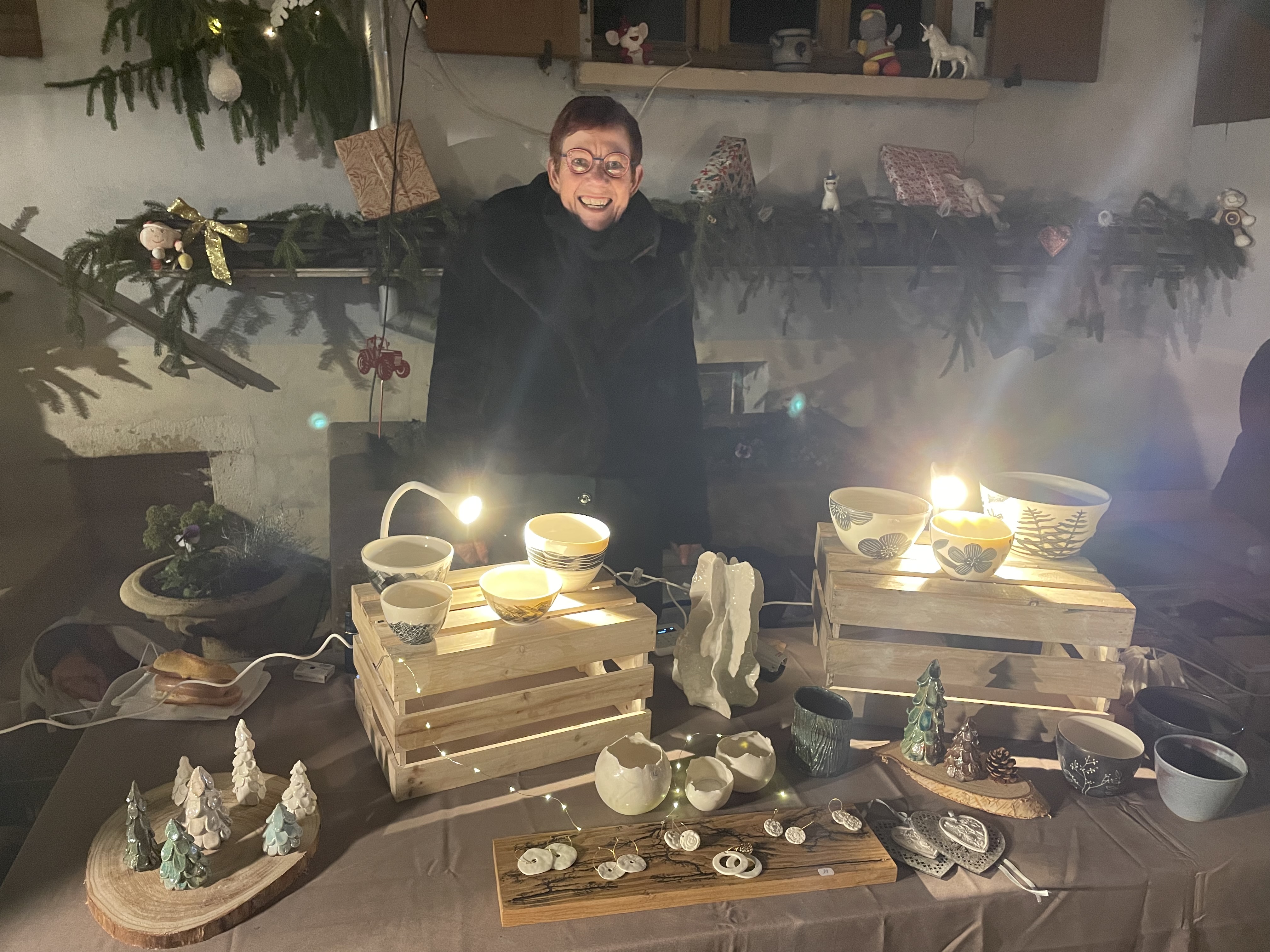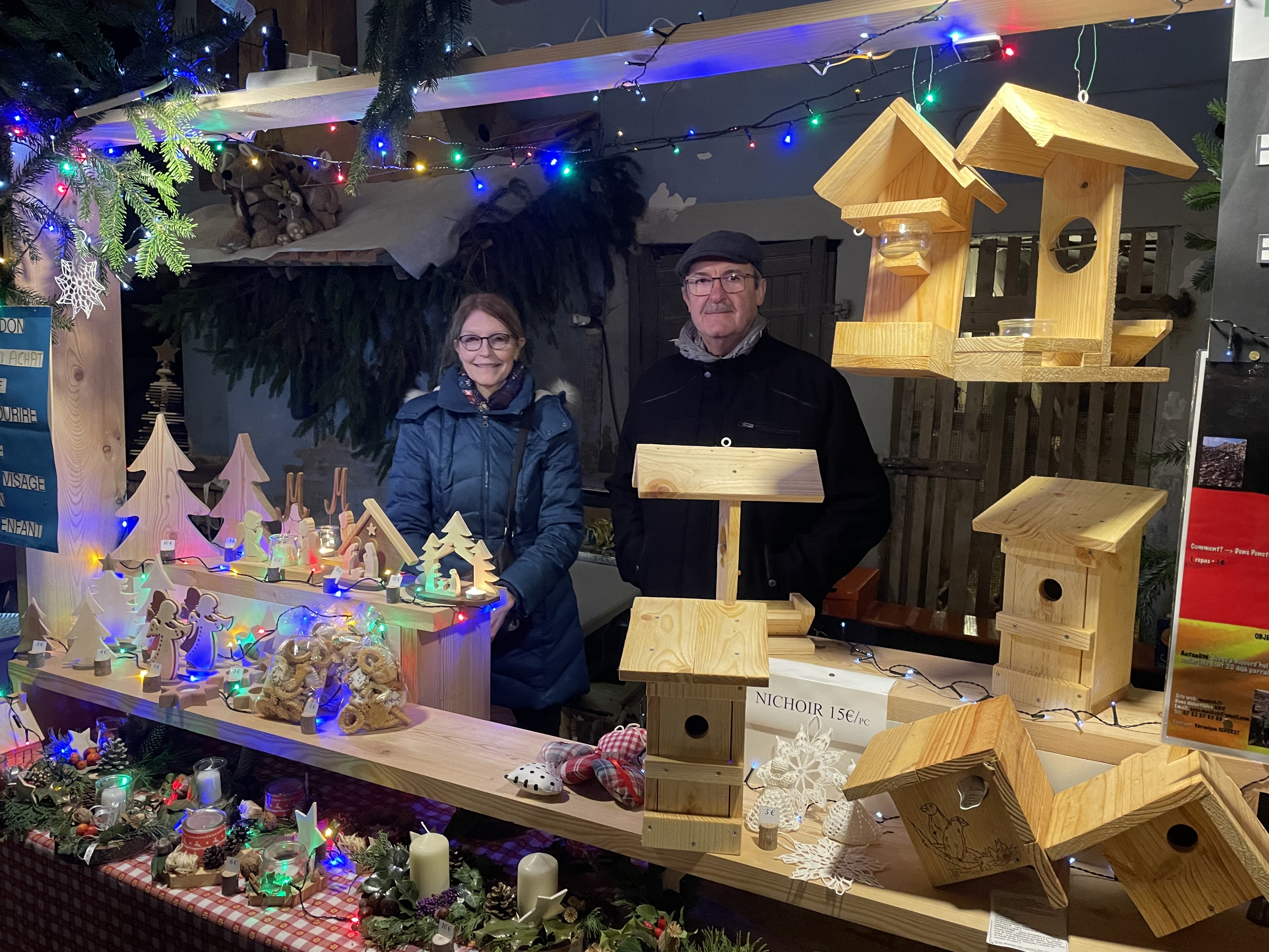 Tout autour de ces étals et aux murs de la ferme étaient accrochées de superbes décorations naturelles ainsi que des objets en bois réalisés par Jean-Paul Simon, menuisier à la retraite. Aux fenêtres, sur des paquets cadeaux trônaient des peluches apportées par les enfants de l’école ainsi que des objets en grès et faïence et des étoiles en bois.
