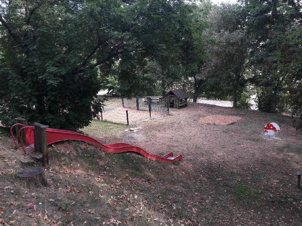 Les plus jeunes peuvent s’amuser avec le toboggan sécurisé, la cabane en bois et deux nouveaux jeux à bascule (installés fin juin 2019). Un bac à sable correctement délimité et protégé des déjections canines s’y trouve également. Une table avec bancs permet aux parents de surveiller tranquillement leurs enfants.