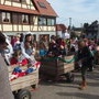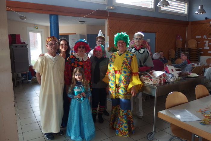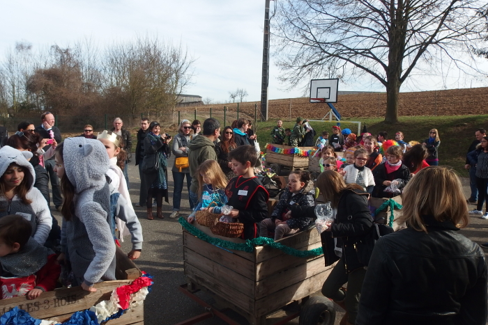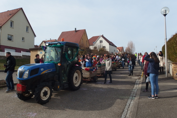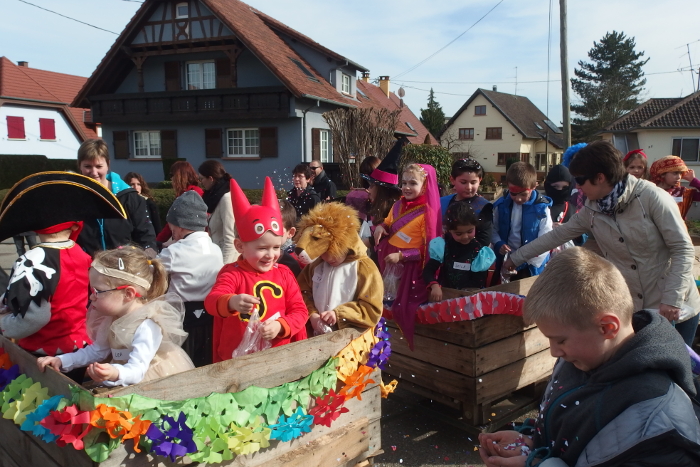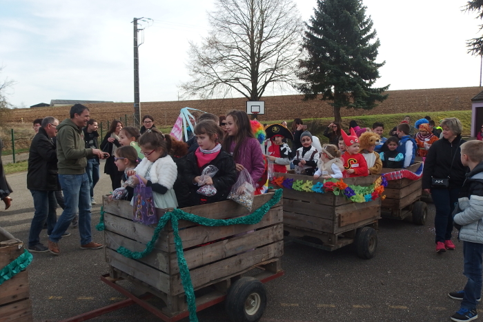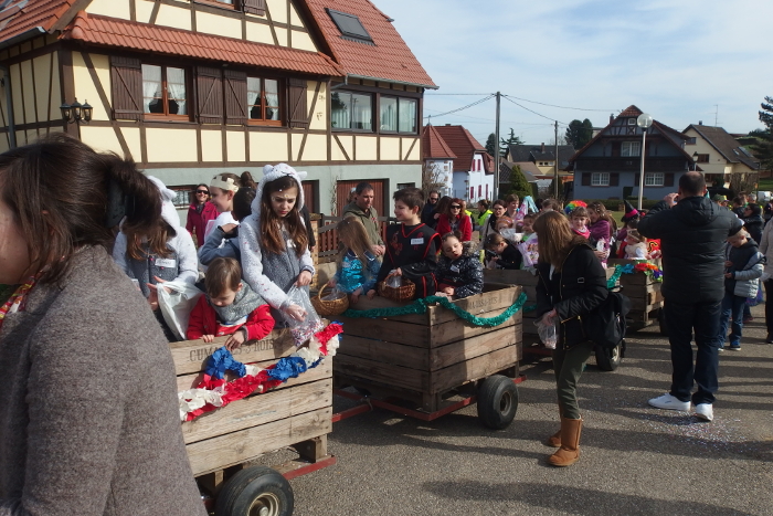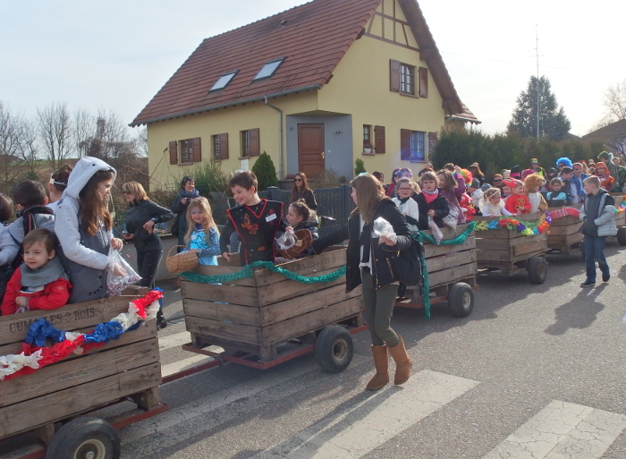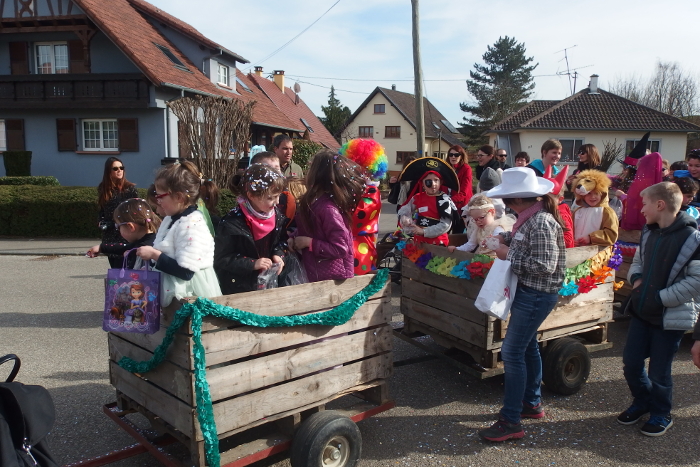 Les cheminots de service - Cathy, Isabelle, Florence, Pierre et Vincent - assuraient l’encadrement et la sécurité de la bruyante cohorte bigarrée. Les parents suivaient en gardant un Å“il sur leur progéniture. Au centre du village, les carnavaliers furent accueillis à la salle des associations par les « anciens » qui tenaient le traditionnel « Kaffee-Kuchen » organisé par la commission « Âge d’Or ». Un moment touchant, avec une distribution de bonbons qui n’a fait que des heureux. Une jolie façon aussi de faire se rencontrer les deux extrêmes de la vie villageoise.