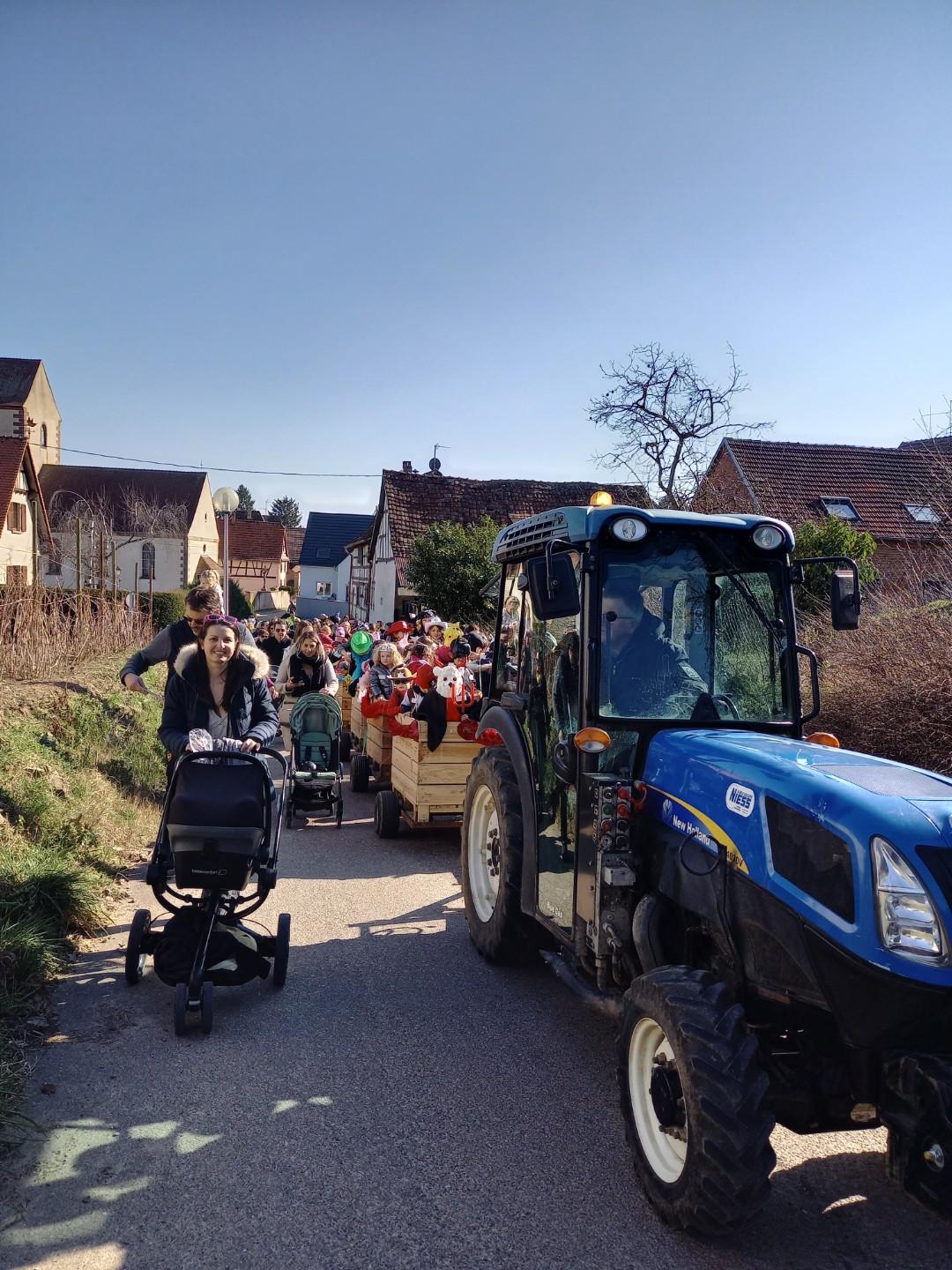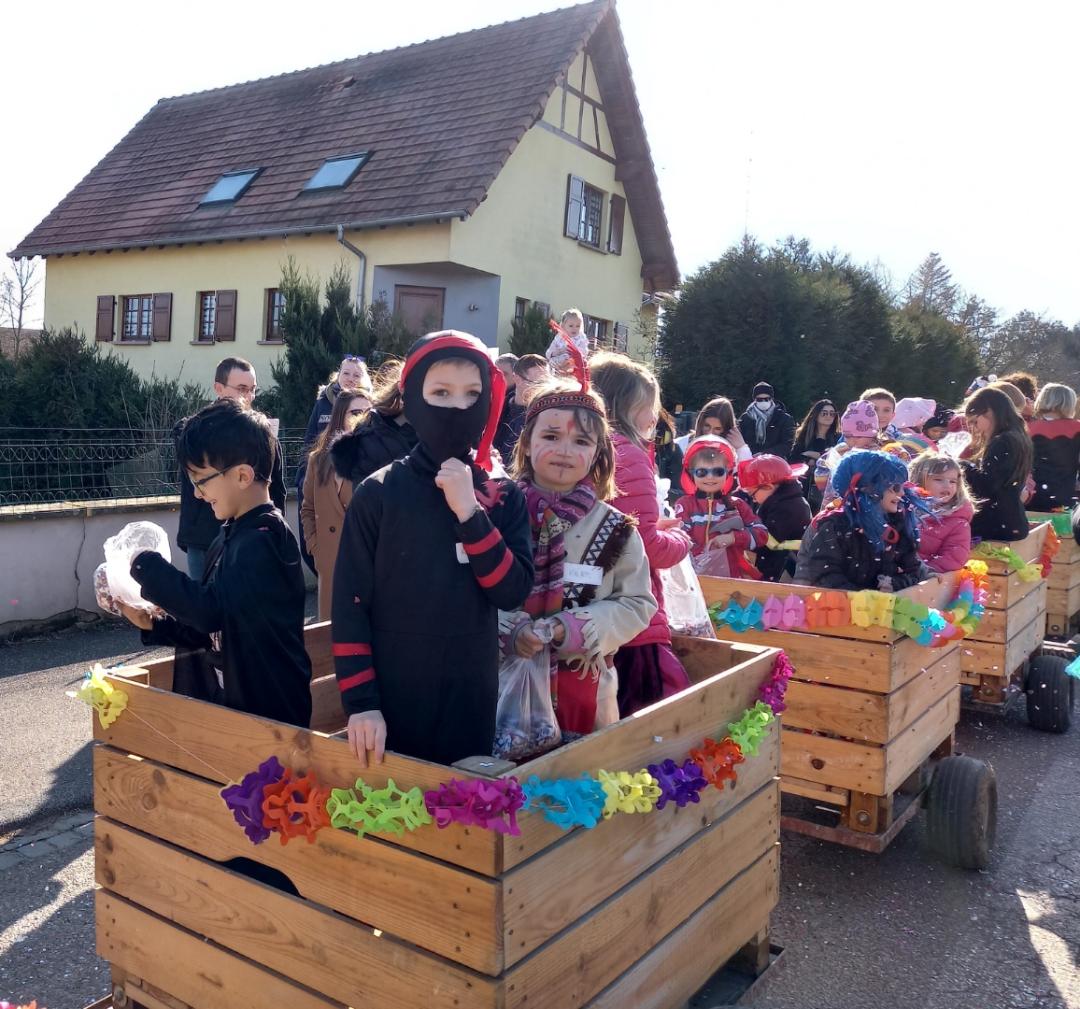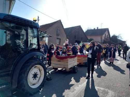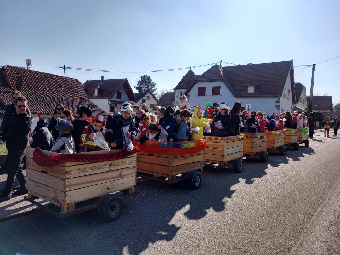 Les petits carnavaliers affluaient et convergeaient de partout vers l’école des deux villages, accompagnés de leurs parents, dont certains étaient également costumés. Dans la cour, Benoît Schmitt, adjoint au maire et exploitant agricole, avait préparé son tracteur. Les sept wagons qui servent habituellement à la récolte et au transport des fruits se transforment en « train des pommiers » pour carnaval.