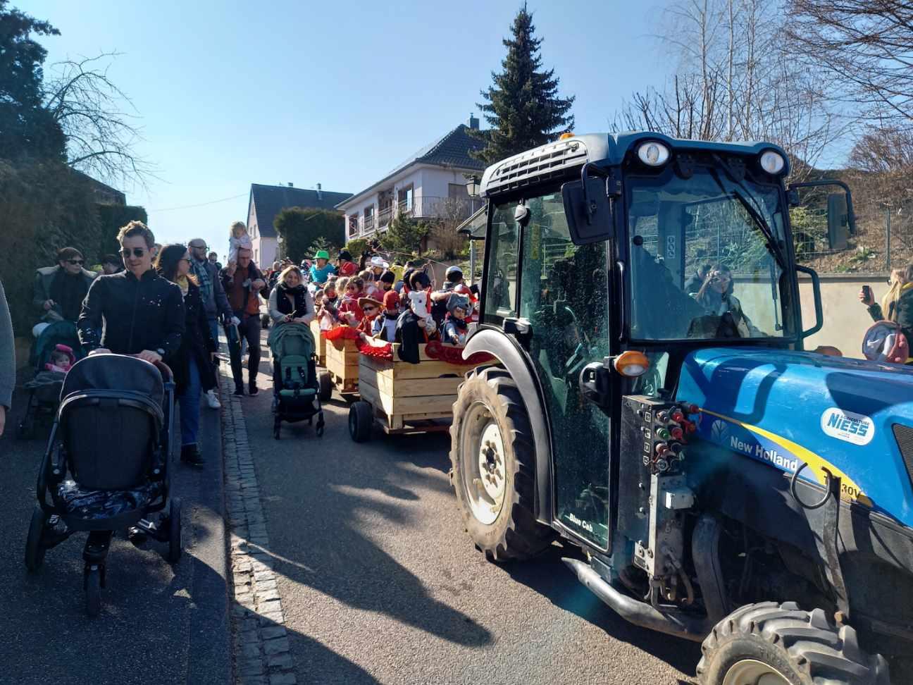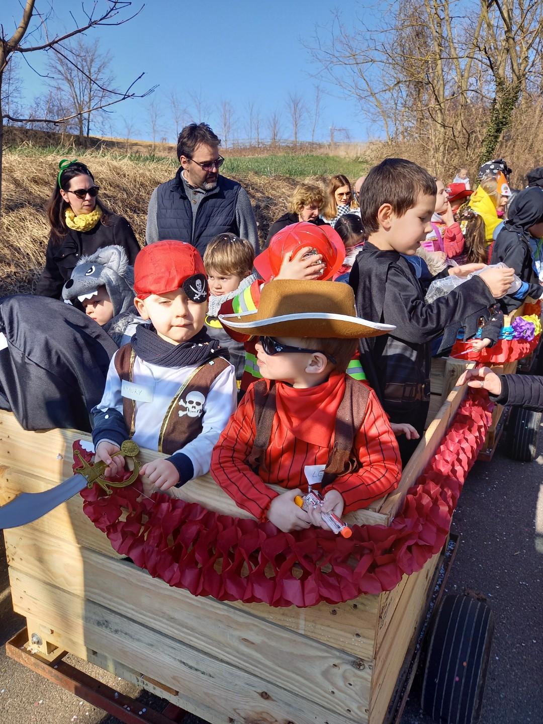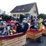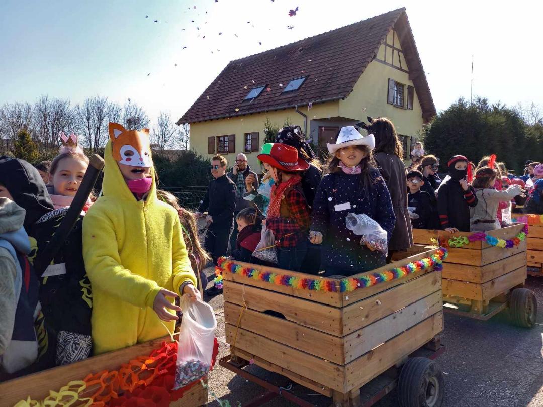 Les petits carnavaliers affluaient et convergeaient de partout vers l’école des deux villages, accompagnés de leurs parents, dont certains étaient également costumés. Dans la cour, Benoît Schmitt, adjoint au maire et exploitant agricole, avait préparé son tracteur. Les sept wagons qui servent habituellement à la récolte et au transport des fruits se transforment en « train des pommiers » pour carnaval.