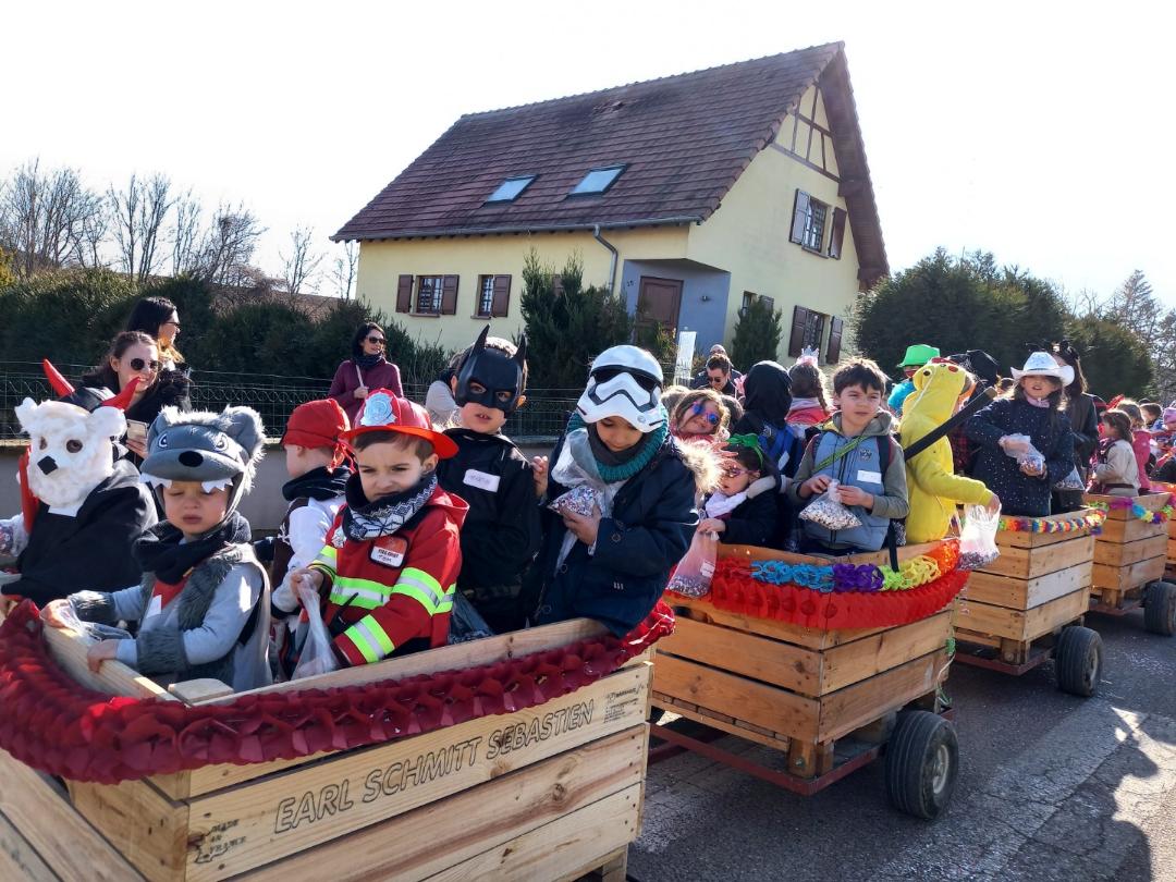 « En wagon tout le monde, le train va partir ! » a lancé la responsable. Le conducteur de la locomotive a pris d’infinies précautions pour mener à bon port la cinquantaine de pitchouns. Des parents et des bénévoles formaient un cordon de sécurité de chaque côté des wagons. Le train a sillonné toutes les rues pour revenir à la gare de départ, en l’occurrence l’école intercommunale de Kienheim-Durningen. Un goûter y a été servi, composé de beignets de carnaval, de brioches et, cette année, de nombreux bonbons, les carnavaliers n’ayant pas pu aller à la collecte de friandises chez les habitants. Un bel après-midi sous le soleil, et en toute insouciance…