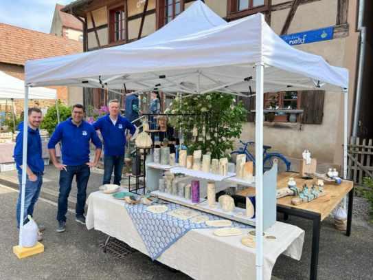 Au début de la rue, c’était l’univers des peintres et des potières. Géraldine, qui dirige l’atelier, présentait ses céramiques, sa collègue, Corinne, ses objets en porcelaine. Michel, un collagiste, recyclait des pubs de vins d’Alsace pour créer des sous-verres ou des cadres. Le visiteur pouvait aussi trouver bijoux, foulards, huiles essentielles et miel. Pour les gourmands, des crêpes alsaciennes faites avec de l’épeautre à Lupstein pouvaient être dégustées au goûter, tout comme les petits fours de Céline, de Gougenheim.