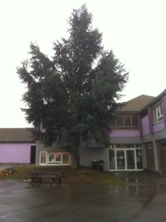 Il y avait un sapin dans la cour du bas près de la porte d’entrée depuis de longues années. Jusqu’au jour où il y a eu une tempête le 12 décembre 2017 deux branches sont tombées. Pour des raisons de sécurité les mairies ont préféré abattre le sapin.