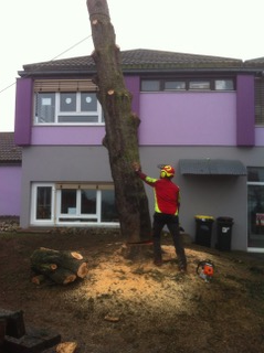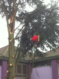 Un mercredi matin, un élagueur est venu dans la cour de notre école, pour couper le sapin. Pour se sécuriser l’élagueur a mis un harnais un casque antibruit et un casque de chantier. Il a commencé à couper les branches du bas en finissant par le haut.
