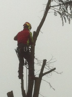 L’homme est arrivé en-haut du vieux sapin. Il coupe la dernière branche de l’arbre avant d’abattre le tronc. Il s’appuie sur deux grosses branches au sommet de l’arbre.
