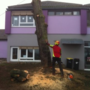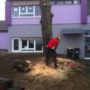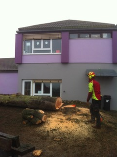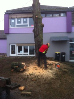 L’élagueur coupe l’arbre de façon à ce qu’il ne tombe pas sur l’école. L’arbre est tombé la mission est terminée. Ensuite, on a regardé sur la souche en comptant les cercles quel âge il avait. Maintenant, ça fait tout vide dans la cour.