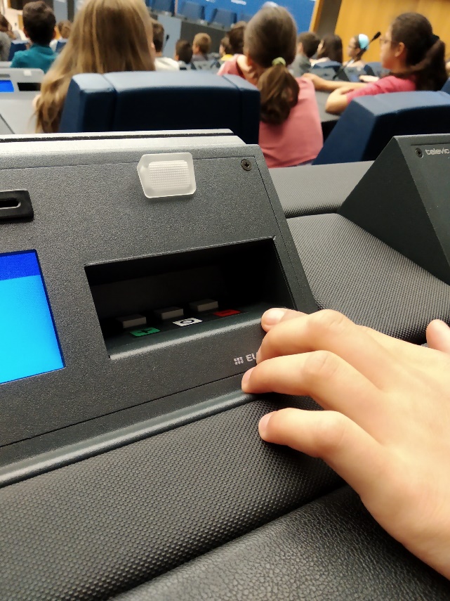 La matinée s’est poursuivie, de manière exceptionnelle cette fois-ci, par une visite spéciale d’une salle de réunion de députés (à l’image de l’hémicycle mais en plus petit). Les enfants des différentes classes lauréates se sont installés aux places de députés, matériel de vote, d’interprétation (casques), de sonorisation (micro) sous les yeux, comme de vrais députés. Là, ils ont pu débattre et voter à l’aide du clavier prévu à cet effet, tel que les élus le feraient, sur un QCM sur le thème du gaspillage alimentaire. Les résultats et statistiques de vote s’affichaient sur grand écran. Cette impressionnante séance de vote s’est clôturée par la remise des diplômes. Félicitation aux élèves pour leur production collective !