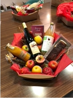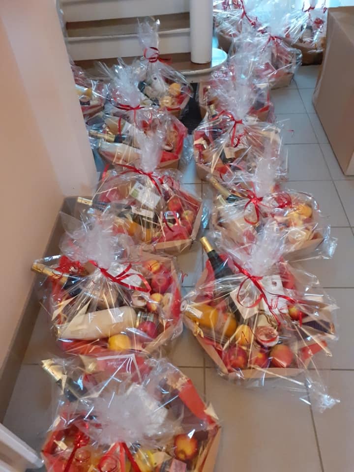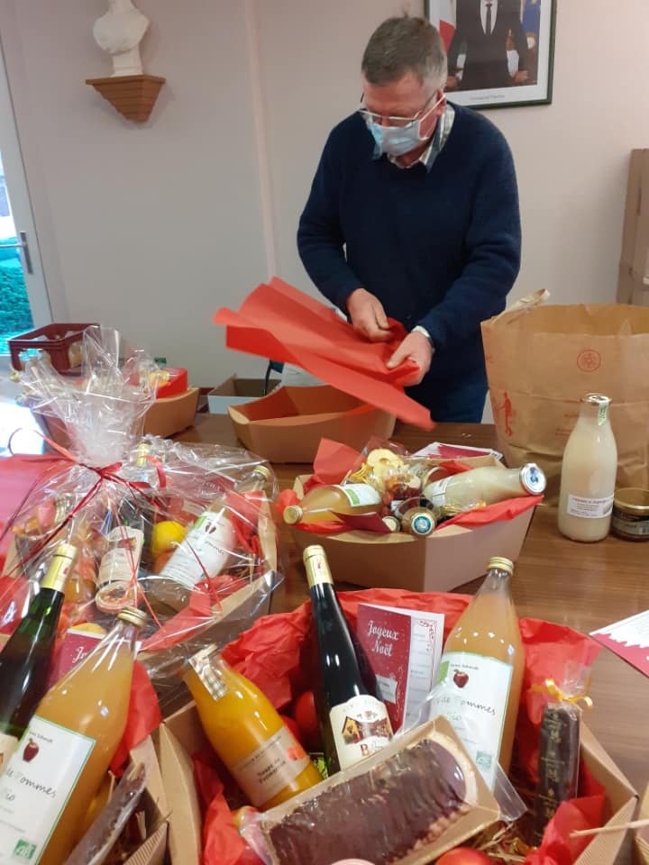 Composés de produits issus de nos producteurs locaux (magret fumé, bouteille de gewurtztramminer/crémant, veloutés d’asperges/potimarron, jus de pommes...), ils ont permis de leur souhaiter de joyeuses fêtes 2020.