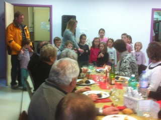 Avant d’attaquer fromages et bûche de Noël, dix enfants de 6 à 8 ans accompagnés de leurs parents sont venus leur faire une surprise. Participant aux NAP (Nouvelles Activités Périscolaires) depuis la Toussaint, les enfants avaient en effet bricolé de jolis petits cadeaux pour les « Papis et Mamies de Kienheim et de Durningen ». Très concentrés, ils ont entonné deux chants de Noël puis ont offerts eux-mêmes leurs présents, ravissant ainsi les convives.