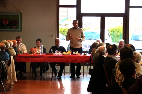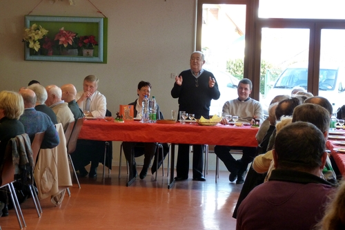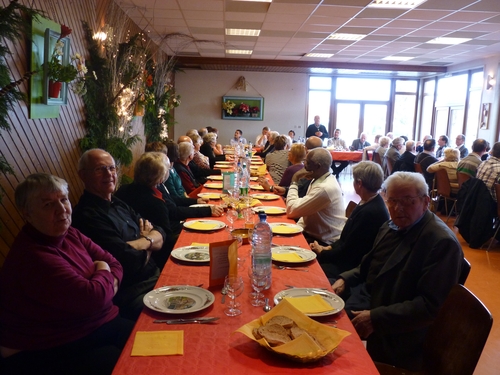Après un mot de bienvenue de M. Exinger et la bénédiction de M. l’abbé Nicolas Acker, la soixantaine de convives a ensuite dégusté du dos de cabillaud accompagné de risotto à l’orge perlé puis du carré de veau aux légumes et spaetzlé. Des bûches de Noël confectionnées par M.Wiand ont conclu le repas.
