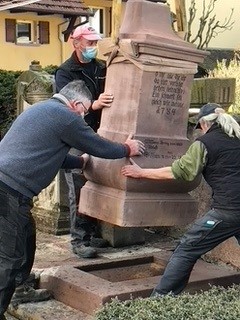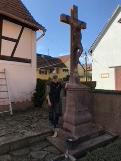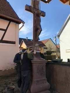 La croix avec le christ en croix (entrée de l’église), rénovée par Mme ARBOGAST a été ré-installée le 1er avril 2021.