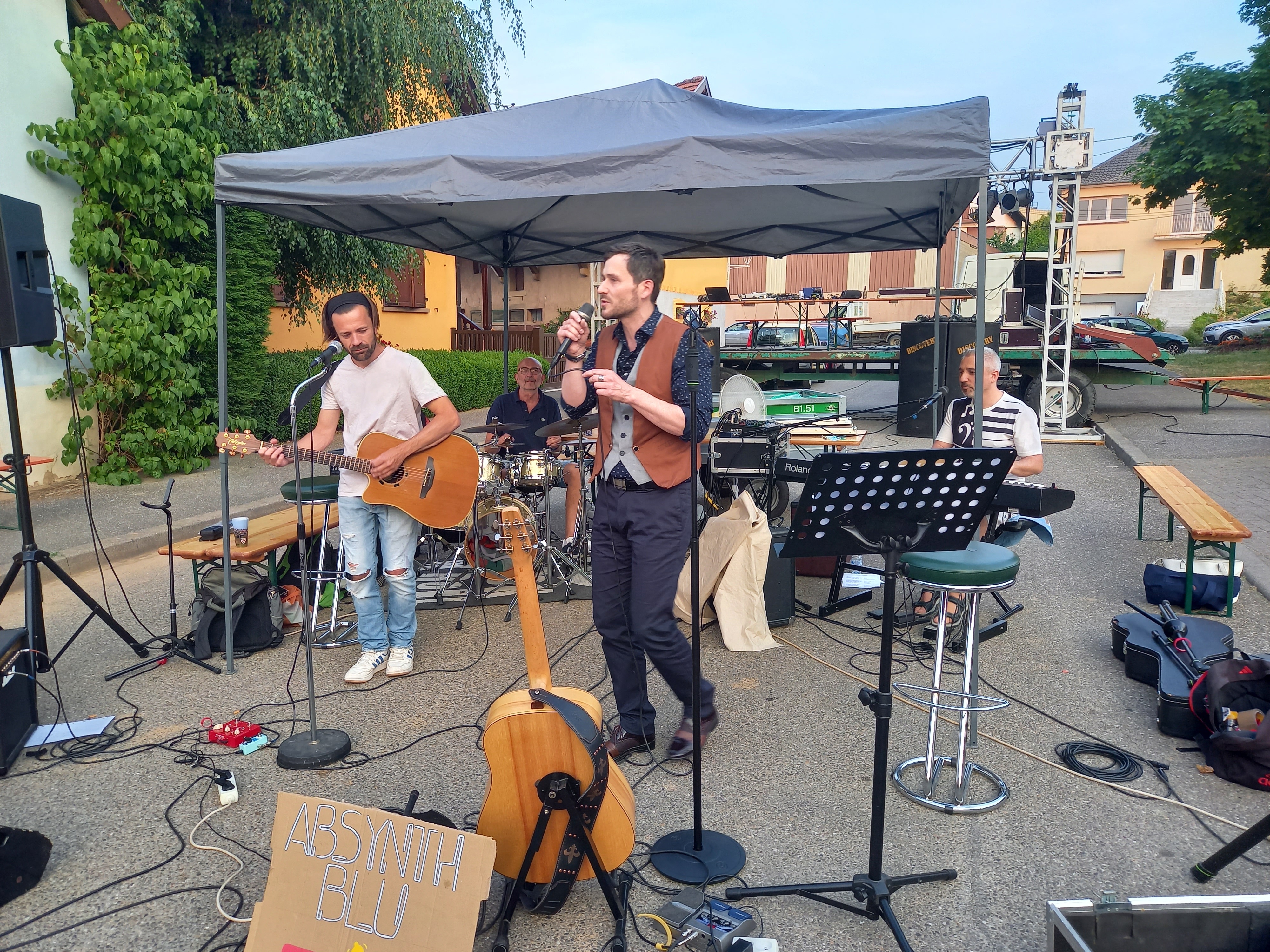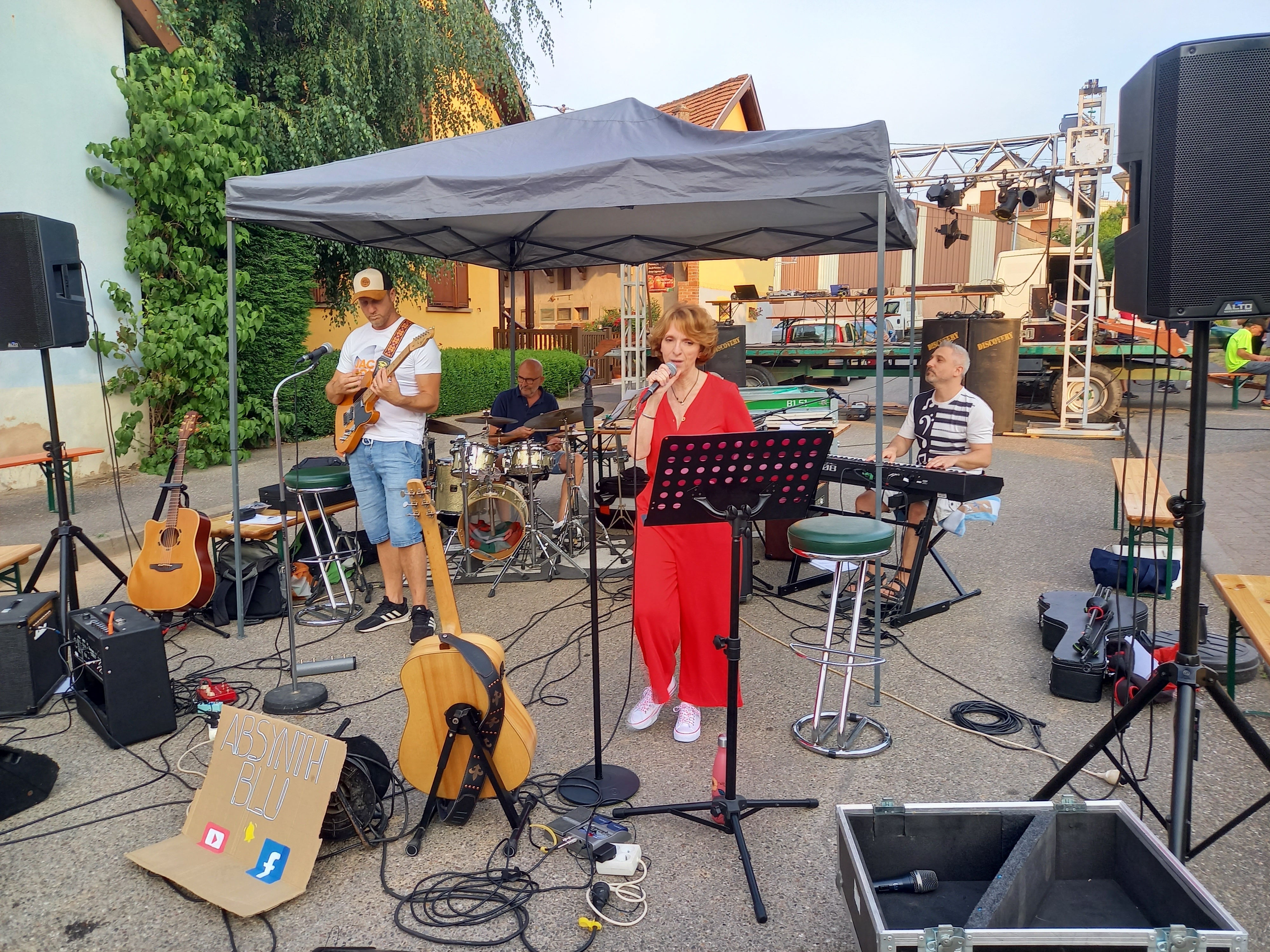 À 19 h 30, samedi 17 juin, le village de Kienheim a résonné au son des notes du petit orchestre installé en face de la mairie. Dans cette rue et sur la place Pierre-Pfimlin, autour des musiciens, un public un peu clairsemé au départ mais qui n’a cessé de grandir, était impatient d’être bercé par cette formation de quatre personnes au répertoire de chansons françaises et internationales. Danielle, la chanteuse et Vincent au clavier, sont originaires de Durningen, quant à Yves à la batterie et Mathieu à la guitare, ils résident dans le village de Kienheim. Gérard, un mélomane, a été scotché par la voix mélodieuse de Danielle. Une voix « magnifique », posée sur les célèbres San Francisco de Maxime Le Forestier ou encore Au fur et à mesure de Liane Foly . Après u ne heure de concert, la chanteuse a passé le relais à Steve, et Nicolas a remplacé Mathieu. Quant à Yves et Vincent, ils ont poursuivi leurs prestations encore une heure, jouant aussi dans cette autre formation créée sous le nom de « Absynth Blu », plus orientée folk et pop français. Il y avait des reprises ( Mes amis, mes emmerdes ) mais surtout des compositions, comme Ange ou démon.