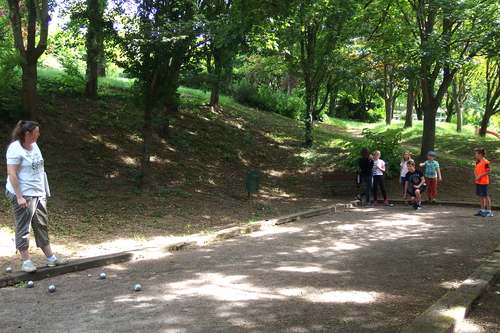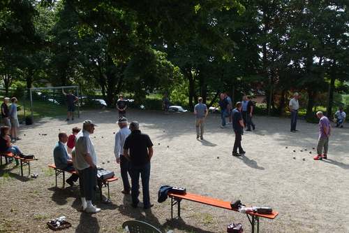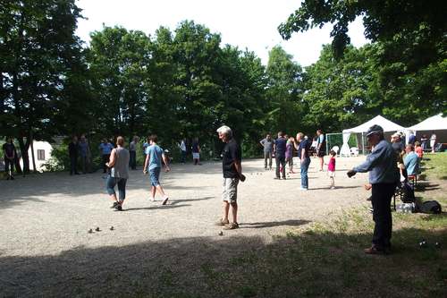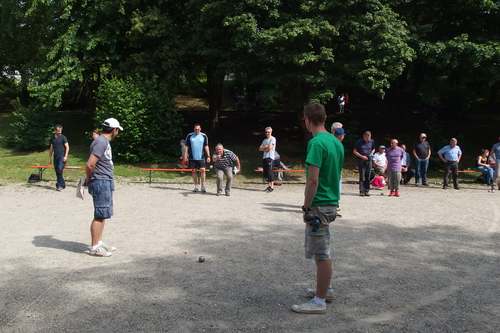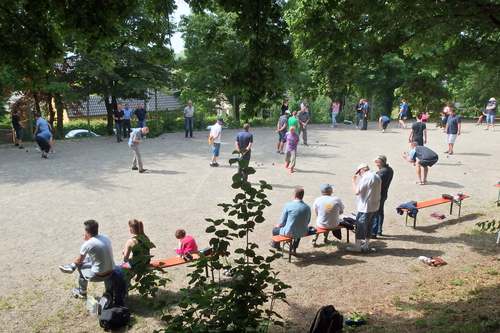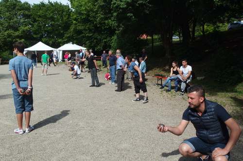 Le « terrain de foot » du lotissement Hüneberg transformé pour l’occasion en 8 terrains de boules a permis aux 25 doublettes inscrites de s’affronter dans la bonne humeur et sous le soleil, tandis que les 6 paires d’enfants utilisaient quant à eux les traditionnels terrains.
