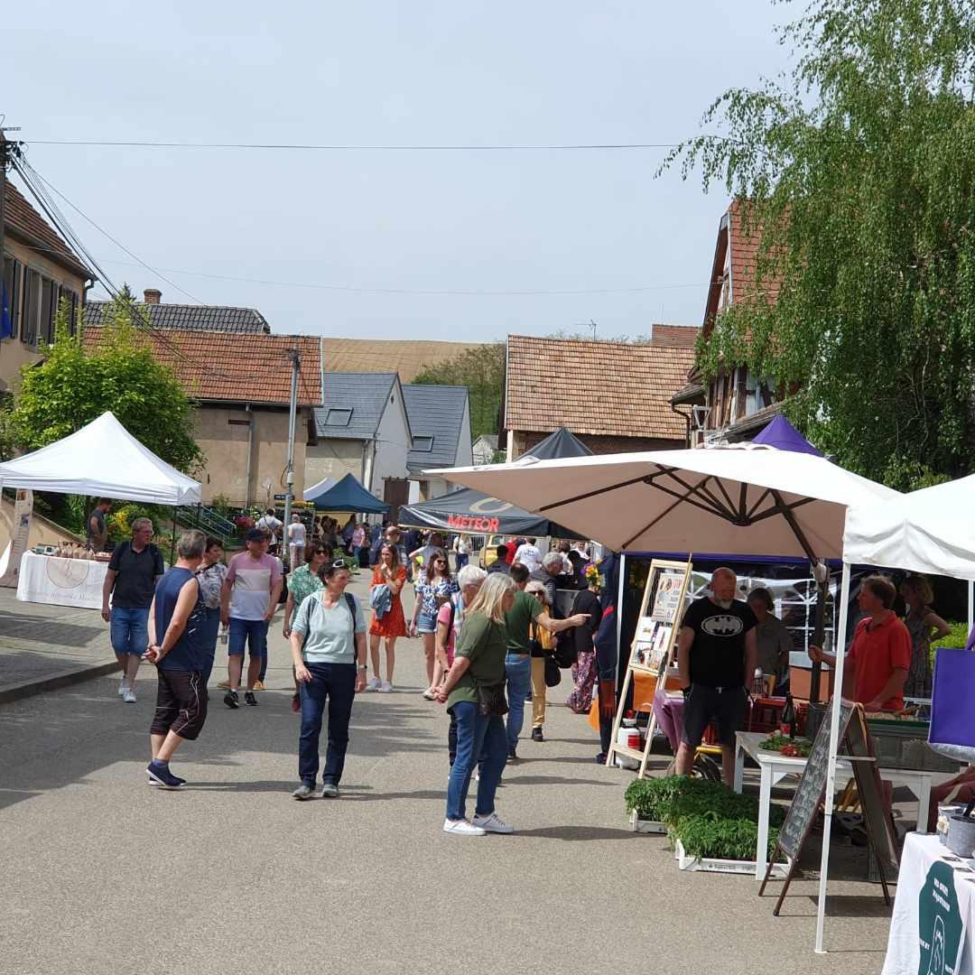 Les 25 étals étaient installés le long de la rue de l’église. Des exposants fidèles proposant leur vin ou bière et notamment les potières, l’apiculteur, la biscuitière et le maraicher du village, l’horticulteur de Maennolsheim, le petit vrac du Kochersberg à Wiwersheim et, cette année, des nouveautés, dont un stand de gâteaux personnalisés, des bougies moulées végétales à la cire d’olive et des sacs en feutre.